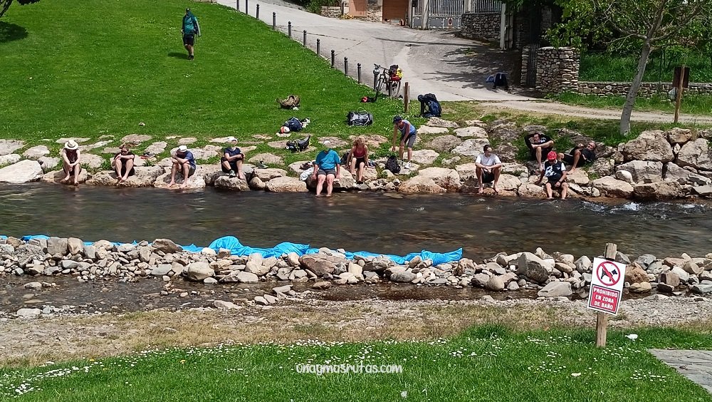 No faltarán los peregrinos en sus merecidos descansos remojando sus pies después del largo día en el Camino de Santiago junto a sus mochilas, como puedes ver en la imagen.